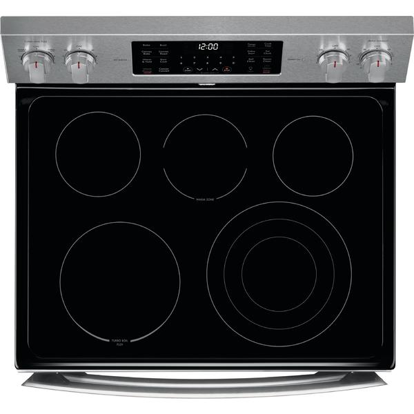 An electric range uses elements under the cooktop for an easy to clean flat surface.